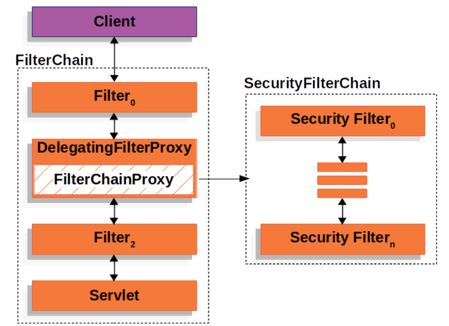 Spring Security는 서블릿 필터 javax.servlet.Filter의 구현체로 동작한다. @EnableWebSecurity 어노테이션과 함께 WebSecurityConfigurerAdapter 추상 클래스를 상속받아 구현함 웹 요청은 이러한 필터 체인을 차례로 통과하게 됨 보통 SpringSecurityFilterChain 이라는 이름으로 Bean 등록